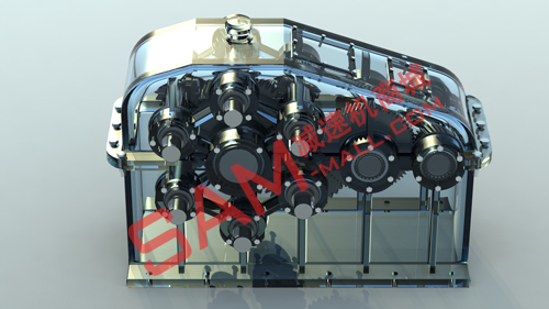 該六軸減速機(jī)的實(shí)機(jī)與上面的三維圖有一定的出入,如六軸中間的主軸采用的是空心軸,中間設(shè)置有水循環(huán)冷卻系統(tǒng)及鐵水管道。本文將此類配置全部取消,沒(méi)有展現(xiàn)。