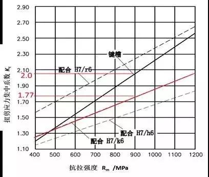 軸受純扭轉(zhuǎn)時(shí),鍵槽和配合邊緣處的有效應(yīng)力集中系數(shù)Kτ見圖7[1]所示。當(dāng)軸的抗拉強(qiáng)度Rm=900MPa時(shí),鍵槽的有效應(yīng)力集中系數(shù)Kτ=2。因此鍵槽對(duì)軸的削弱是很大的。