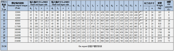 1、P系列行星齒輪減速器采用漸開線行星齒輪傳動,合理利用內、外嚙臺、功率分流。因此具有重量輕、體積小、傳動比范圍大、效率高、運轉平穩(wěn)、噪聲低、適應性強等特點;